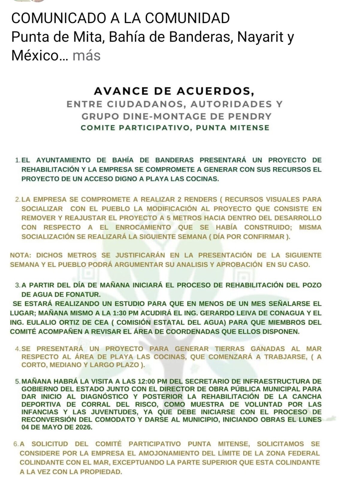 El comunicado también incluye otros compromisos: que el Ayuntamiento de Bahía de Banderas presentará un proyecto de rehabilitación y la empresa se comprometerá a generar un acceso digno a Playa Las Cocinas; que iniciará un proceso de rehabilitación del pozo de agua de Fonatur; que se hará un estudio para señalar un nuevo punto en menos de un mes; que se planteará un proyecto de “tierras ganadas al mar”; que habrá visita de autoridades estatales y municipales para revisar una cancha deportiva; y que el Comité Participativo Punta Mitense pide amojonar el límite de la zona federal colindante con el mar.