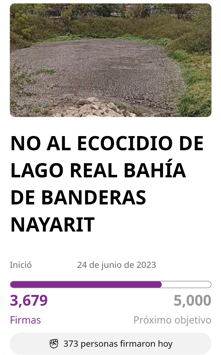 A través de una petición en la mundialmente conocida plataforma Change.org, ciudadanos de Bahía de Banderas están pidiendo que se salve a la laguna de Lago Real del ecocidio que está sufriendo al realizarse obras en el lugar, por parte dela empresa Dynamica, que seca el sitio y lo intenta rellenar.