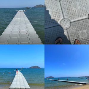 El funcionamiento de estas estructuras es relativamente simple pero eficaz: en lugar de apoyarse sobre pilotes fijos o una losa rígida, el muelle flota mediante piezas huecas o de gran flotabilidad que se conectan como un rompecabezas, permitiendo que la superficie suba y baje con el nivel del agua y absorba parte del movimiento del oleaje. En las fotos puede apreciarse, además, que el sistema está contenido mediante líneas de amarre laterales y una configuración modular recta con remate transversal en la punta, algo típico en muelles pensados para embarcaciones menores, lanchas de paseo, pesca ribereña o desembarque recreativo.