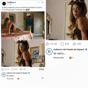 El incidente ocurrió en la página de Facebook “Cinéfilos”, una comunidad dedicada a noticias del séptimo arte. La publicación anunciaba que la actriz Sydney Sweeney interpretará a una modelo de OnlyFans en la tercera temporada de la serie de Netflix. Ante esta noticia, la cuenta verificada del Gobierno del Estado de Nayarit reaccionó escribiendo textualmente: “Se sabía….”.