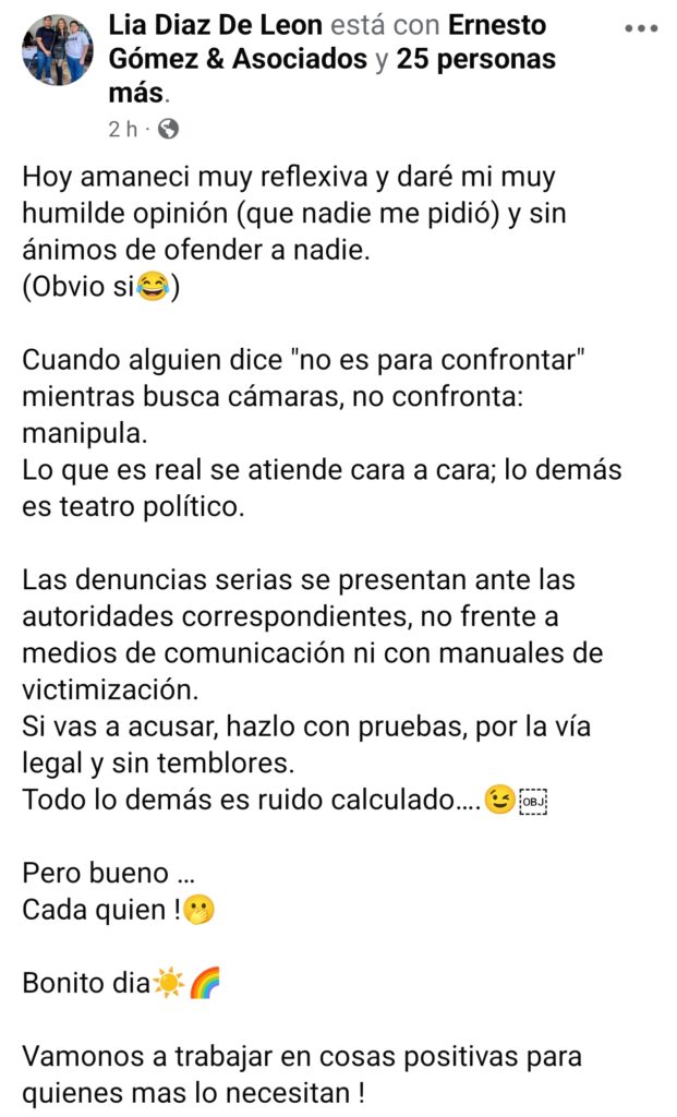 Tomando este contexto, es que pocas horas después la ex alcaldesa Lía Castro Díaz de León utilizó sus redes sociales para publicar una reflexión cargada de ironía que ha sido interpretada como una respuesta directa a la síndico. Castro inició su mensaje con un tono punzante: